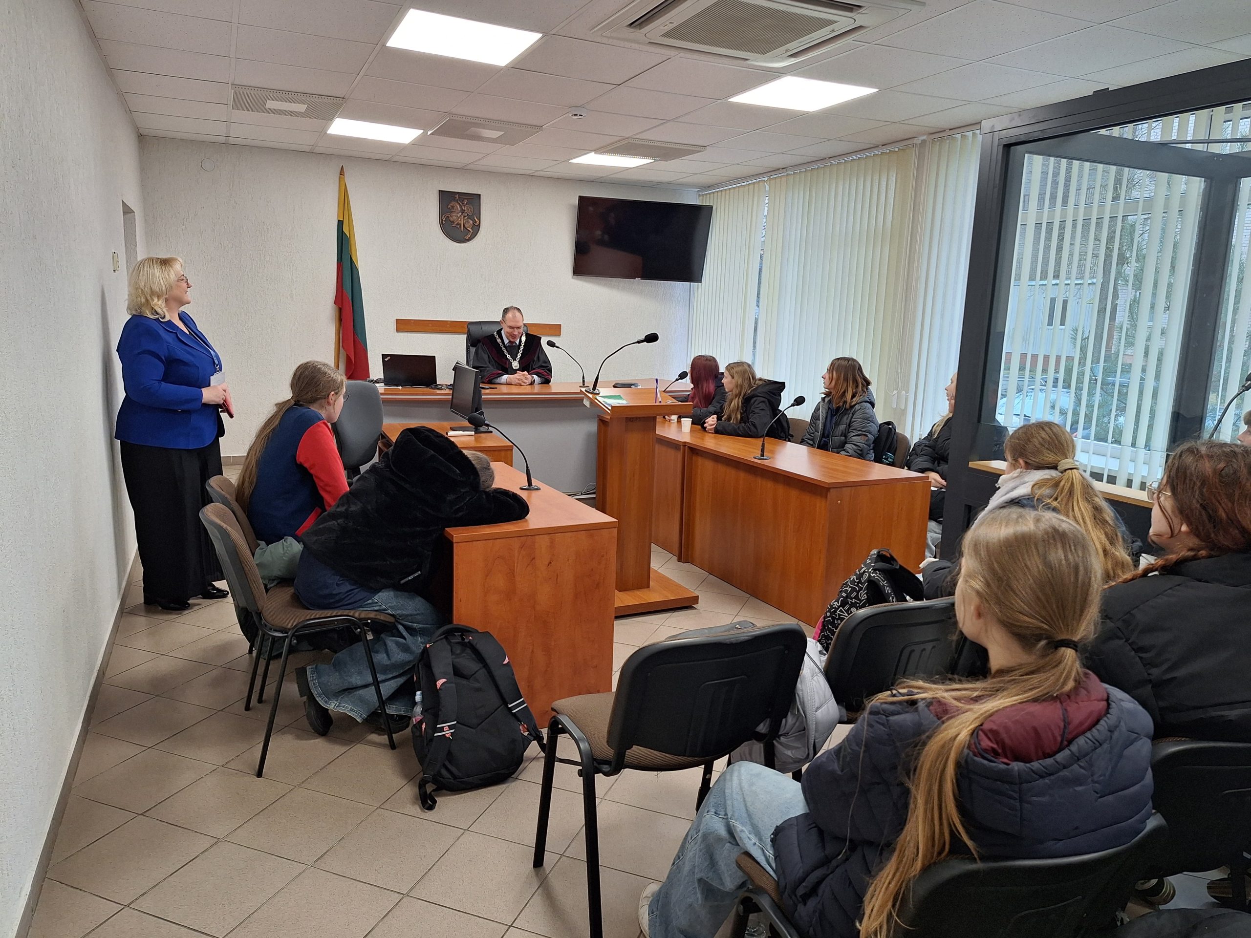 Ekskursiją vedė teisėjas ir teisėjo padėjėja 👨⚖️👩💼, kurie mokiniams papasakojo apie savo kasdienį darbą, sprendimų priėmimo procesą 🧩, teismo posėdžių eigą ir profesijai reikalingas savybes 📚. Teisėjas paaiškino, kokios žinios būtinos norint dirbti šioje srityje 🏫, kiek metų trunka studijos 📖 ir kokia yra teisėjo atsakomybė priimant teisingus bei objektyvius sprendimus ⚖️.